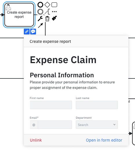 For user tasks/start events that are already linked, clicking on the link button opens a dialog which shows a preview of the form the user task is linked to. It is possible to navigate to the linked form by clicking on it, or you can use the Unlink button to remove the link.