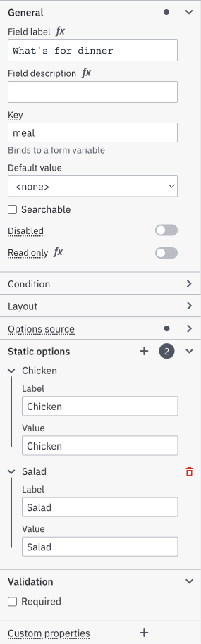 Scroll down to the Static options section of the properties panel to add radio options. Since there are two options for the dinner, add an extra value by clicking on the plus sign. Enter the value
