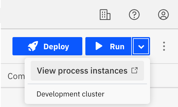 The process start will be confirmed via a notification message on the screen. Click the chevron icon next to Run to open more options. Click View process instances to see the running process in Operate.